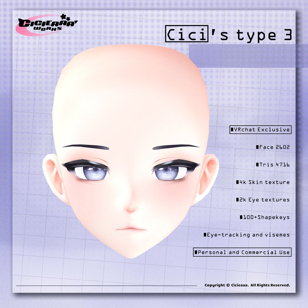 - You must credit this asset (Including meshes and eye textures) to the specific link to this item: ''cicieaaavr.gumroad.com/l/cicis3 '' or ''Cici's type 3 Male by Cicieaaa#7777 ''(So that nobody buys the wrong head); Also you need to make it clear with your credit that no one can take my head meshed off your finished model, they have to buy it directly from me to use it.